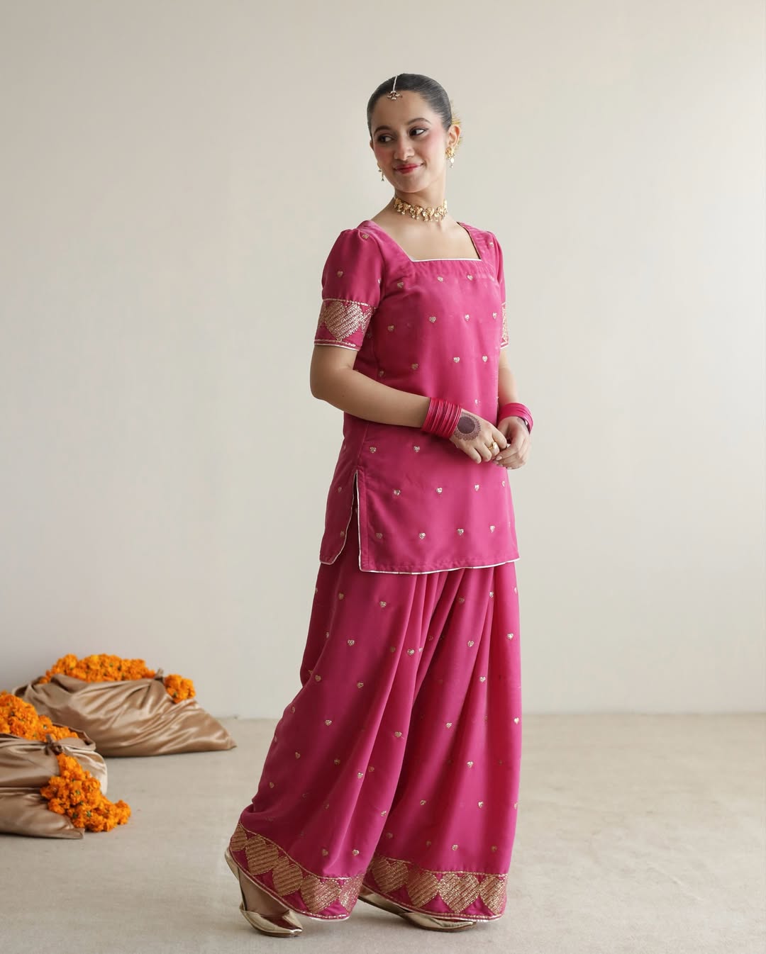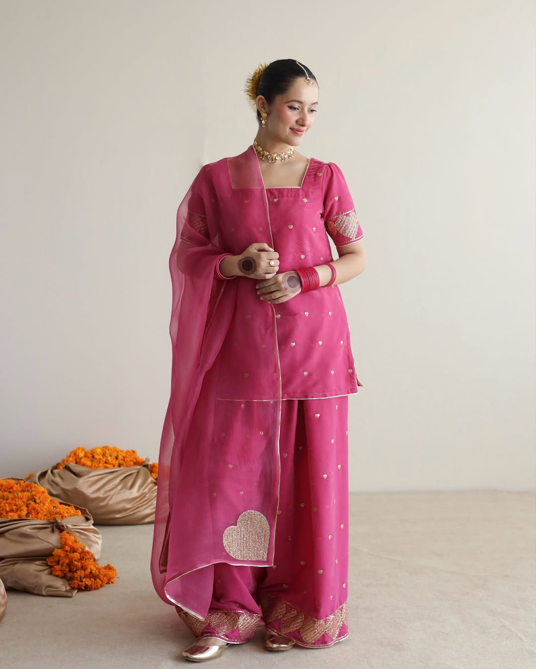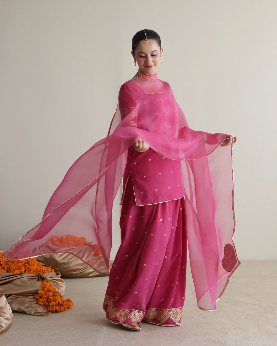 This exquisite Festive/Party Wear Kurta Set is a stunning ensemble perfect for any celebration. The short pink PK Raw Silk Kurta features intricate embroidery for a touch of elegance. Paired with a Farshi Shalwar in the same fabric and a sheer Organza Dupatta, this 3-piece set is a must-have for summer festivities.
