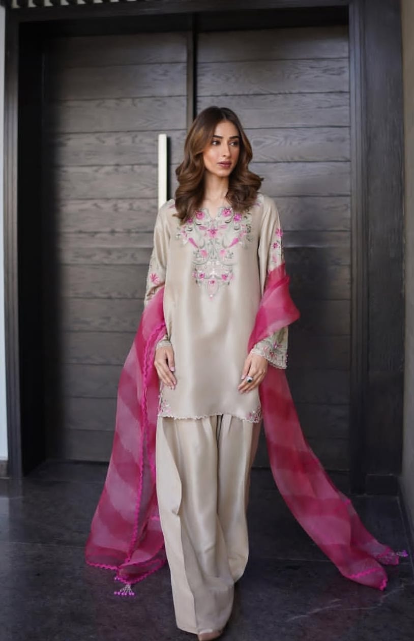 parwana – a graceful 3-piece stitched outfit crafted from pure silk, featuring intricate multi-colored embroidery and delicate pearl embellishments that radiate elegance.