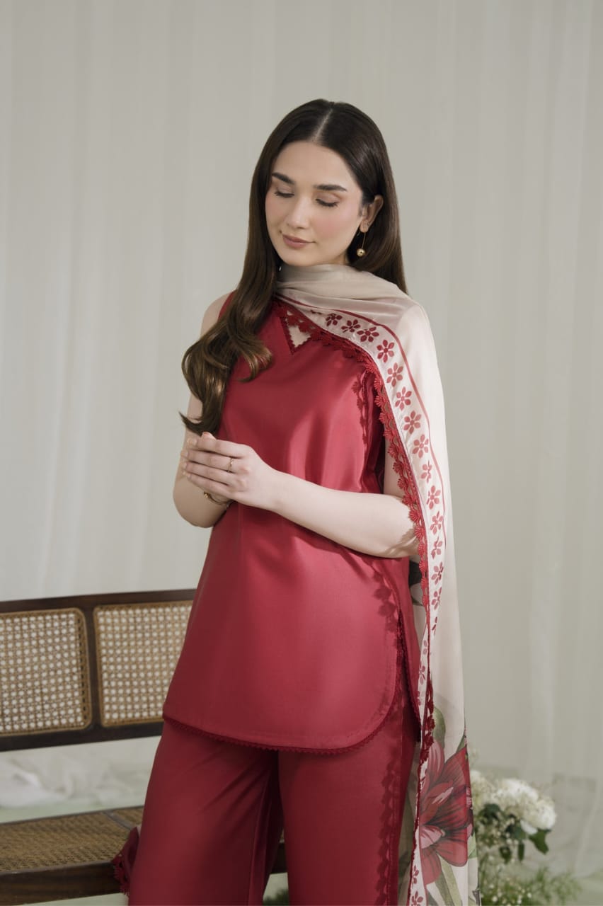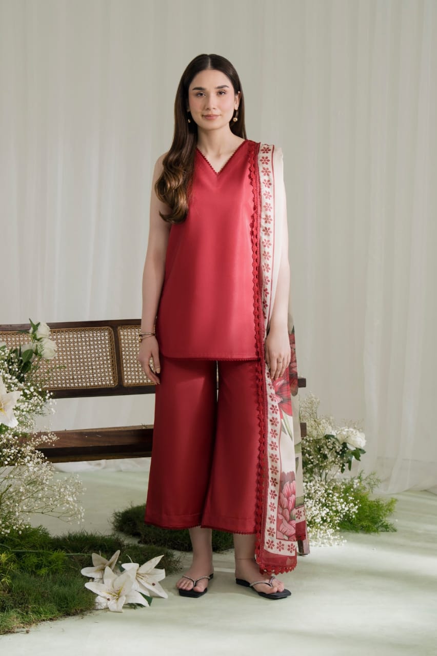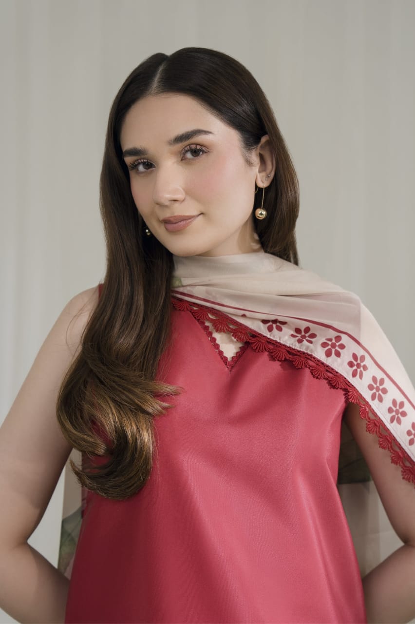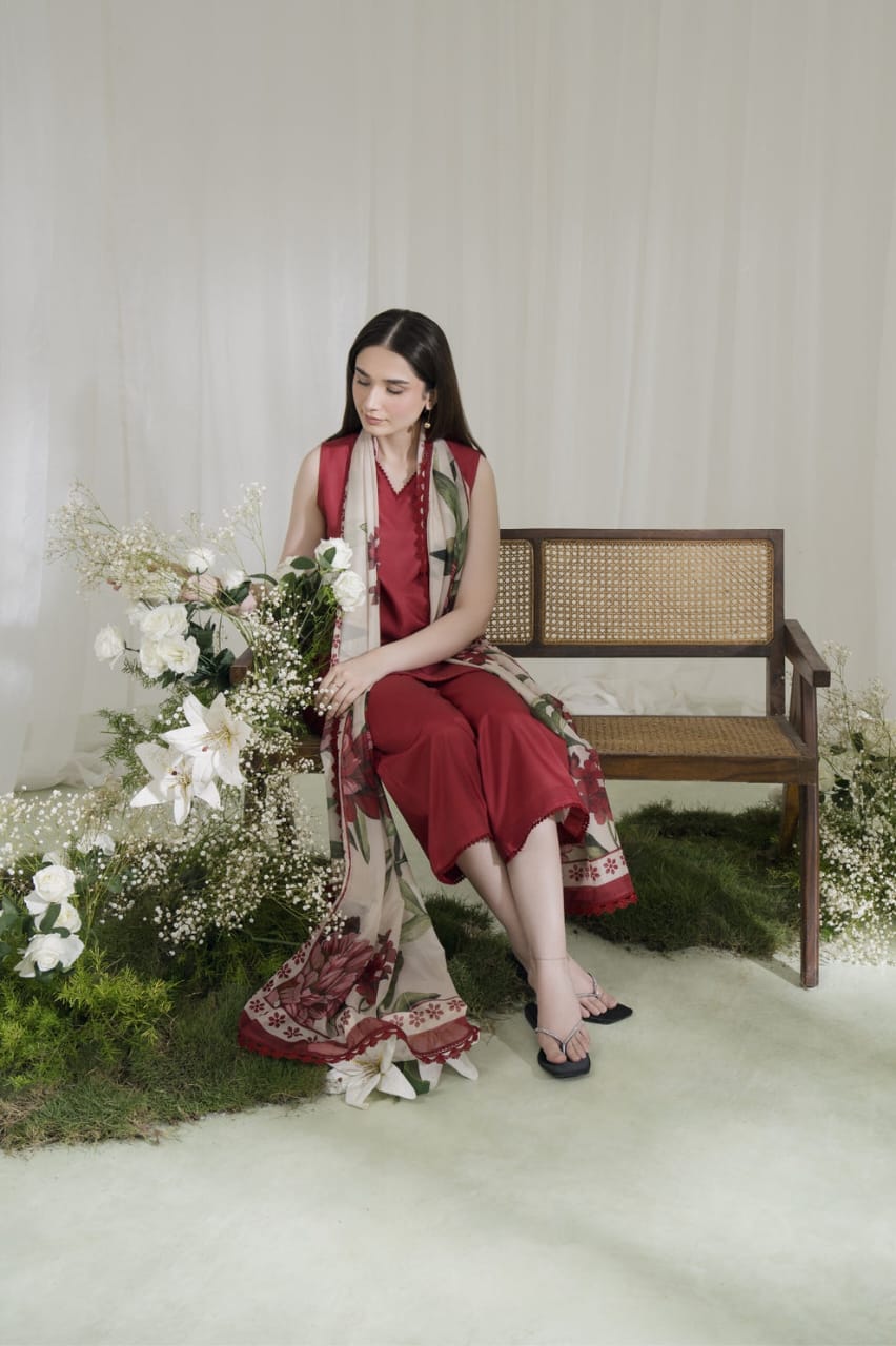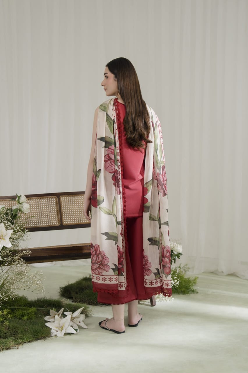 This elegant ensemble is crafted from premium Dhanak fabric, known for its soft texture and comfortable feel. It is paired with a delicately designed organza dupatta featuring digital floral printing, adding a refined and graceful touch to the outfit.