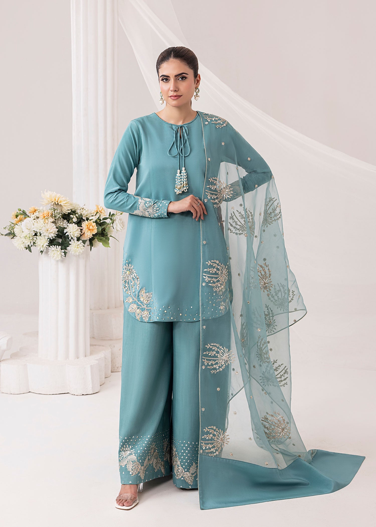 Elevate your festive look with this elegant stitched 3-piece outfit crafted from premium silk fabric. The shirt features intricate tilla and sequin embroidery, adding a subtle yet luxurious shine. Paired with a beautifully embroidered organza dupatta that enhances the grace of the ensemble. The look is completed with a stylish farshi shalwar, giving it a traditional yet modern appeal..