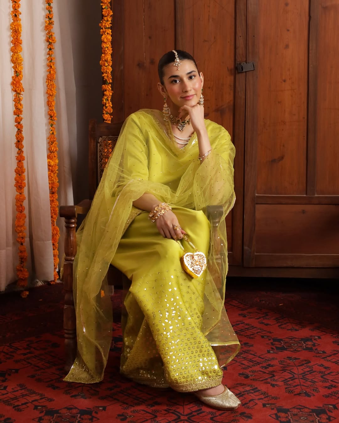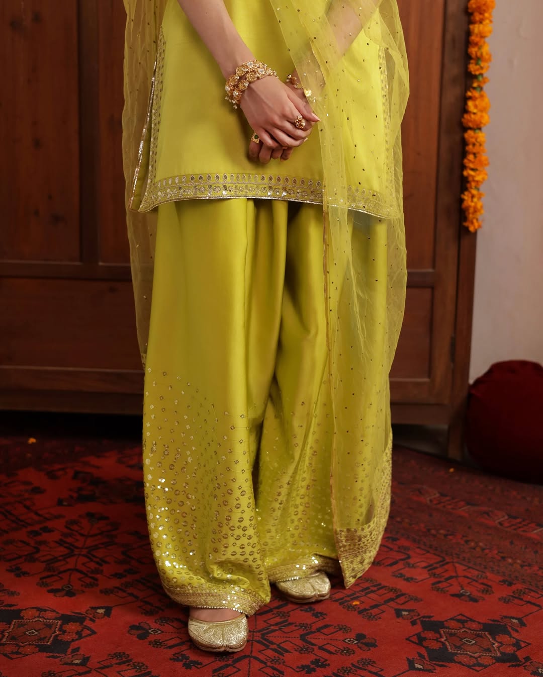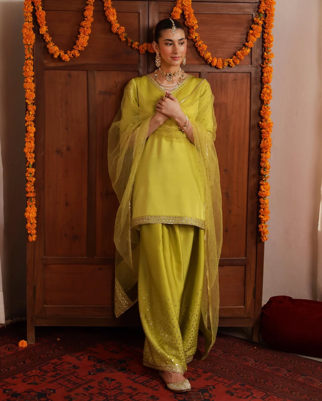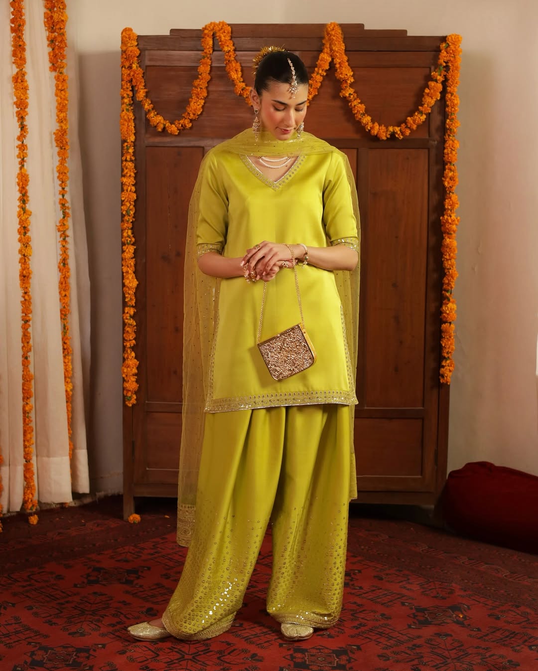 This elegant ensemble is crafted from premium silk fabric, beautifully enhanced with delicate tilla embroidery that adds a refined festive charm. The soft embellishments along the neckline and borders create a graceful silhouette,